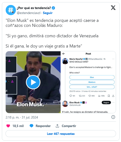 “Si gano yo, él dimite como dictador de Venezuela; si gana él, le invito a un viaje gratis a Marte”, comentó el dueño de X a la encuesta de un seguidor en dicha red social.