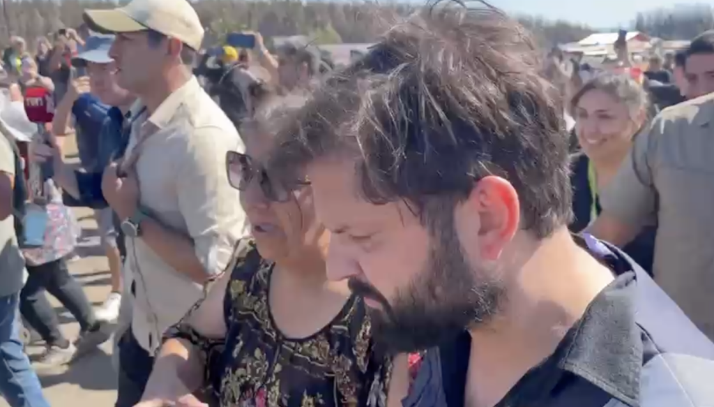 Gritos e insultos marcaron la visita del presidente Gabriel Boric a Punta de Parra, en la comuna de Tomé, hasta donde llegó por los incendios forestales que afectan a la zona.